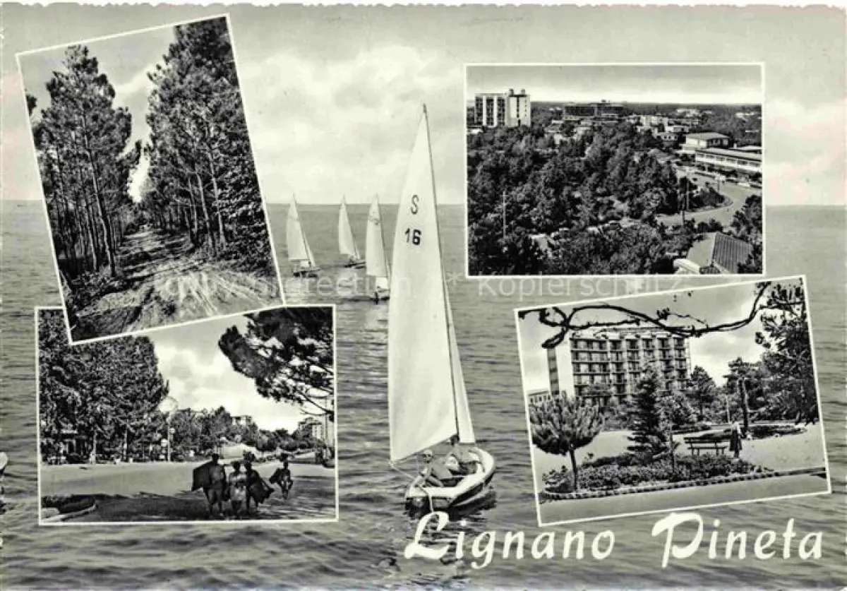 LIGNANO Pineta Veneto IT Stadtpanorama Hochhaus Waldpartie Segelregatta postalisch gelaufen Erhaltung siehe scans [FriedD77] alte Postkarte Frie Katcode 11240