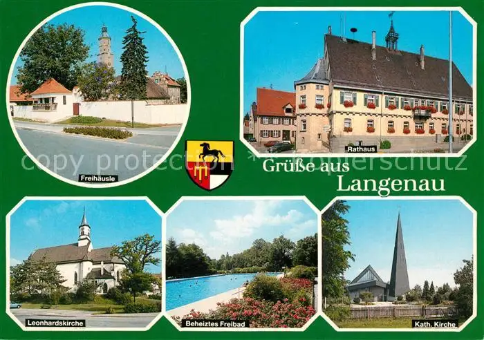 Langenau Wuerttemberg Kategorie Alte Ansichtskarten Postkarten bx49127 Langenau_Wuerttemberg Freihaeusle Rathaus Loenhardskirche Freibad Kirche Langenau Wuerttemberg postalisch nicht gelaufen 1986 Erhaltung siehe scans [FriedD77]