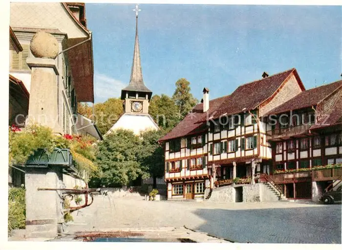 Laupen_BE Ortsmotiv mit Kirche Fachwerkhaeuser Brunnen Laupen_BE postalisch nicht gelaufen 1955 Erhaltung siehe scans [FriedD77] Frierer