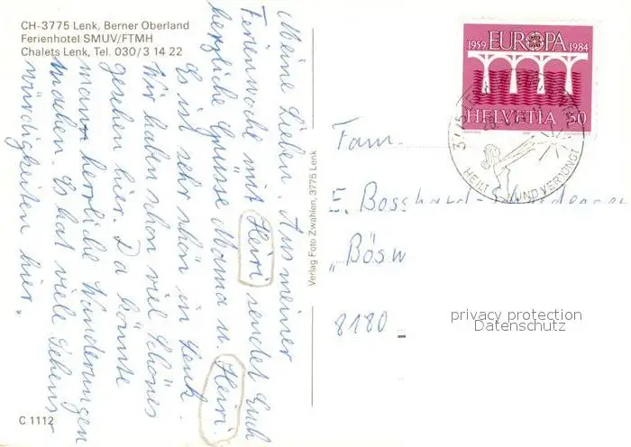 Lenk_Simmental Ferienhotel SMUV Chalets Landschaftspanorama Alpen Lenk Simmental postalisch gelaufen 1984 Erhaltung siehe scans [FriedD77] Frierer