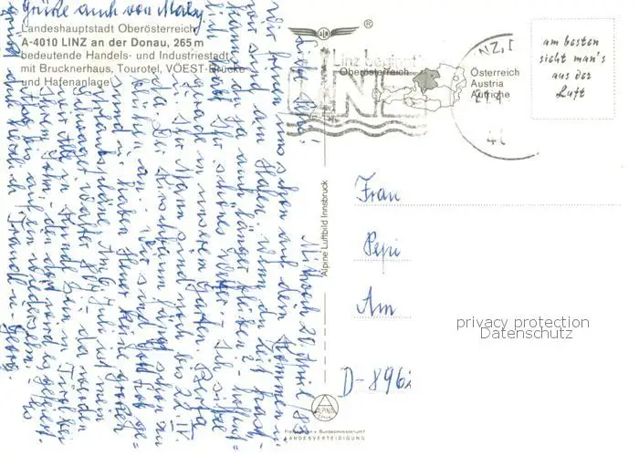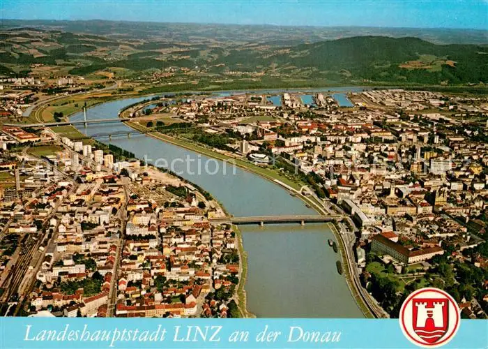 Linz_Donau Panorama Landeshauptstadt Linz_Donau postalisch gelaufen 1983 Fliegeraufnahme Erhaltung siehe scans [FriedD77] Fliegeraufnahme Frierer