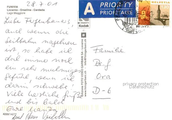 Locarno_Lago_Maggiore mit Orselina und Cardada Funivia Locarno_Lago_Maggiore postalisch gelaufen 2001 Erhaltung siehe scans [WerneD78] WernPID7