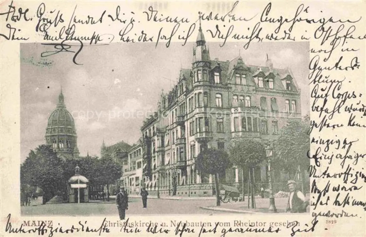 alte Postkarte MAINZ Rhein Christuskirche und Neubauten vom Rheintor gesehen postalisch gelaufen Erhaltung siehe scans [FriedD77]