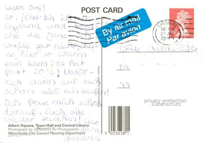 Manchester_GB Albert Square Town Hall and Central Library aerial view postalisch gelaufen 1985 Erhaltung siehe scans [FriedD77] Frierer