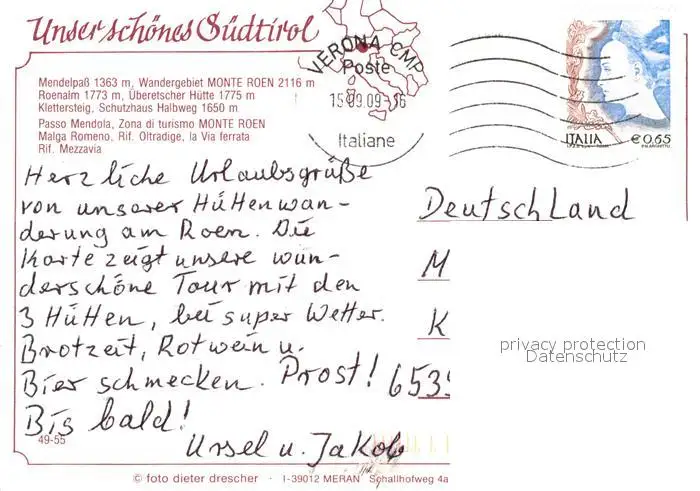 Mendelpass Wandergebiet Monte Roen Roenalm ueberetscher Huette Klettersteig Schutzhaus Halbweg Mendelpass postalisch gelaufen 2009 Erhaltung siehe scans [FriedD77] Frierer