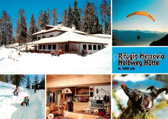 AK / Ansichtskarte Mendelpass_1363m_Passo_della_Mendola_IT Schutzhaus Halbweg Gleitschirmflieger Gastaum Schlittenfahrt Auerhahn