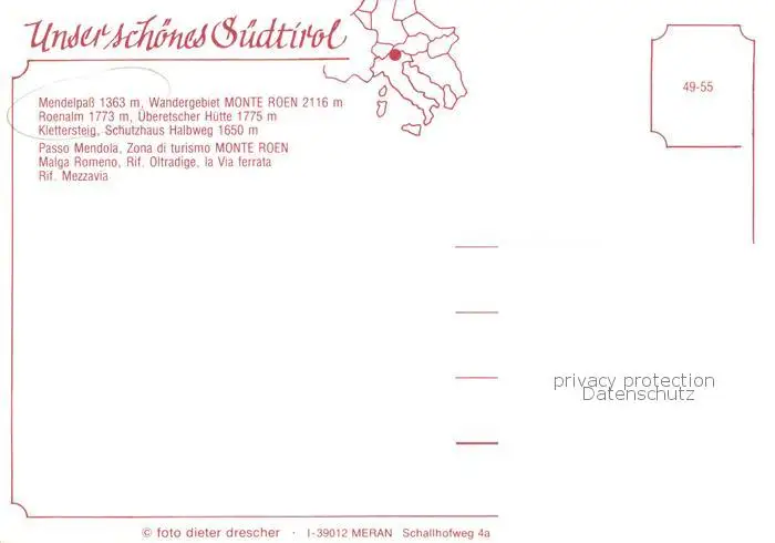 Mendelpass_1363m_Passo_della_Mendola_IT Wandergebiet Monte Roen Roenalm ueberetscher Huette Klettersteig Schutzhaus Halbweg postalisch nicht gelaufen nach 1965 Erhaltung siehe scans [FriedD77] Frierer