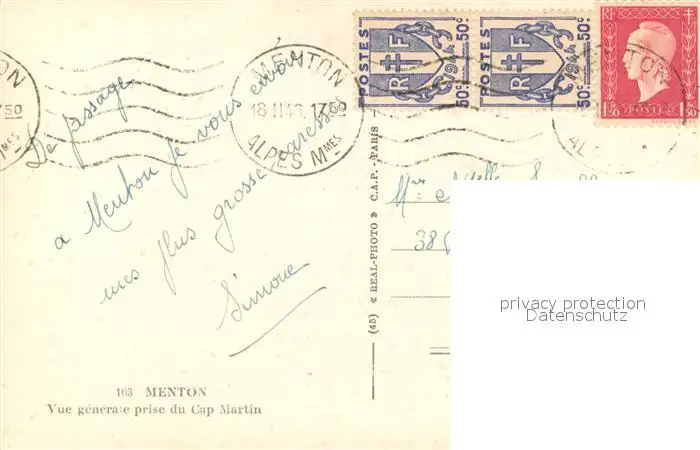 Menton_Alpes_Maritimes Vue générale prise du Cap Martin Côte d'Azur Menton_Alpes_Maritimes postalisch gelaufen 1946 Erhaltung siehe scans [FriedD77] Frierer