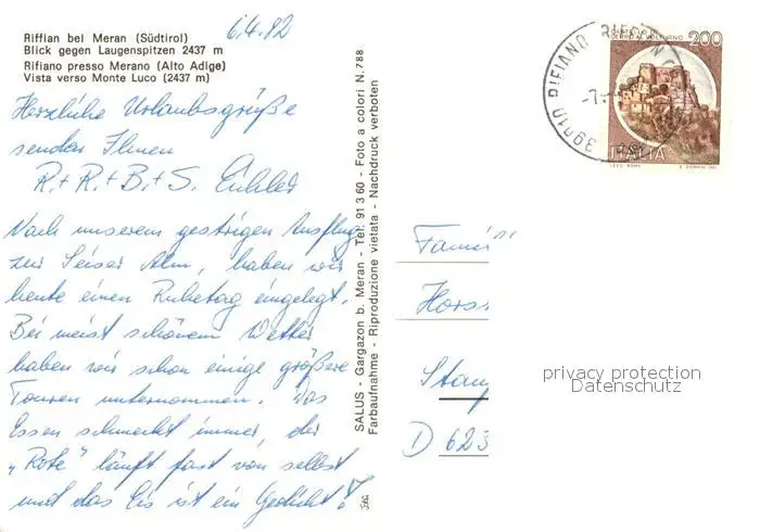 Meran_Merano Rifflan Laugenspitzen Kirche Meran Merano postalisch gelaufen 1982 Erhaltung siehe scans [KathaD81] Kathoren