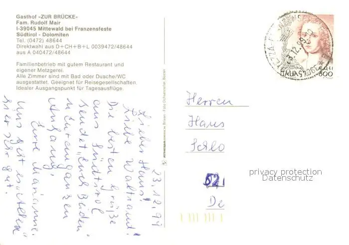 Mittewald_Mezzaselva Gasthof Zur Bruecke Panorama Mittewald Mezzaselva postalisch gelaufen 1999 Erhaltung siehe scans [FriedD77] Frierer