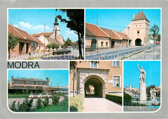 AK / Ansichtskarte Modra_Slovakia Stadtzentrum mit Kirche Stadttor Denkmal