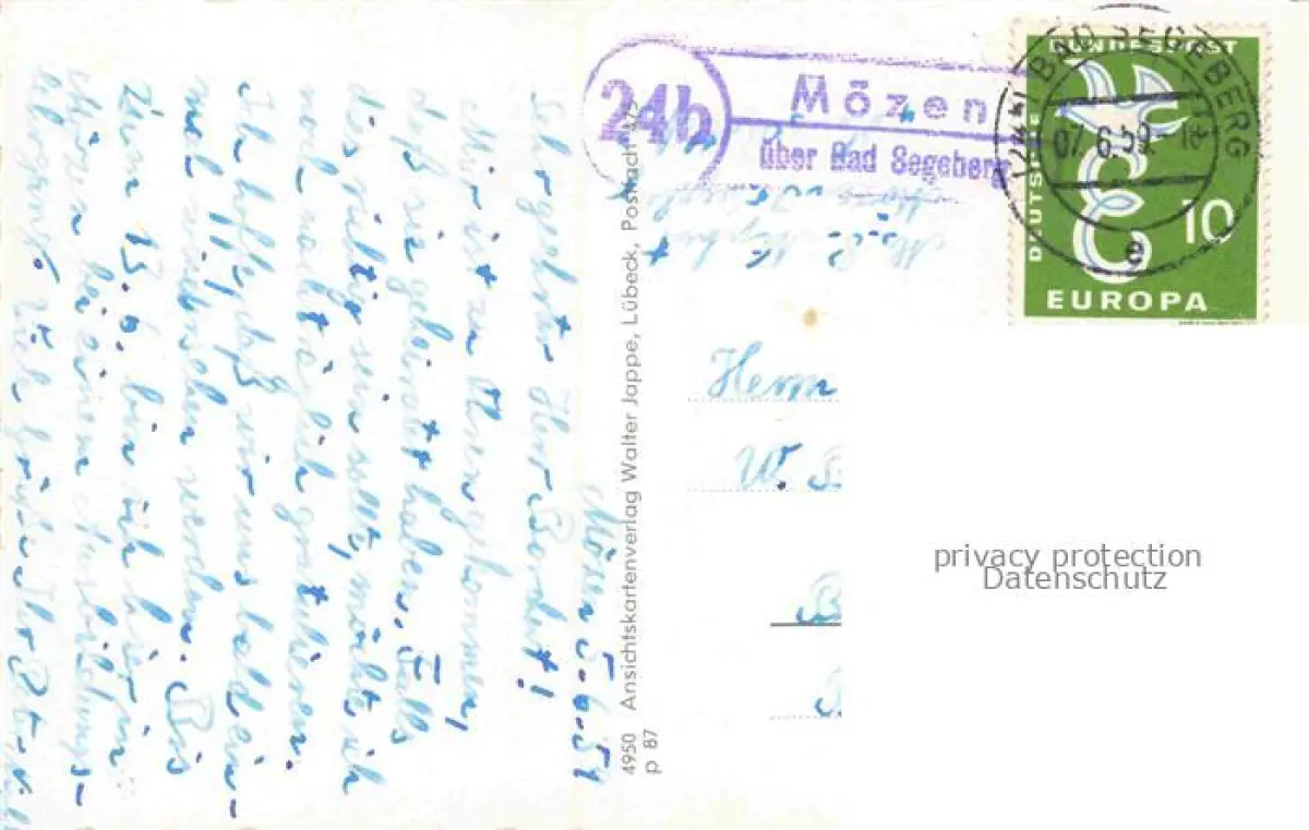 alte Postkarte Moezen am See Segeberg Schleswig-Holstein Gemischtwaren Post Partie am See Bruecke Dorfstrasse postalisch gelaufen Erhaltung siehe scans [FriedD77]