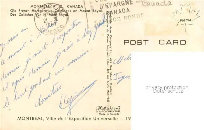 Montreal_Quebec Des Caleches sur le Mont Royal Montreal Quebec postalisch gelaufen 1967 Erhaltung siehe scans [WerneD78] WernPID7