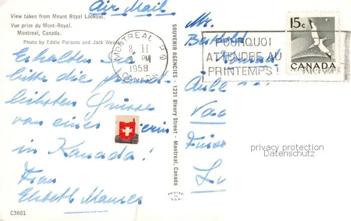 Montreal_Quebec Vue prise du Mount Royal Montreal Quebec postalisch gelaufen 1958 Erhaltung siehe scans [WerneD78] WernPID7