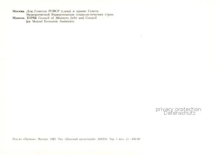Moscow_Moskva RSFSR Council of Ministers and Council for Mutual Economic Assistance Moscow Moskva postalisch nicht gelaufen 1985 Erhaltung siehe scans [FriedD77] Frierer