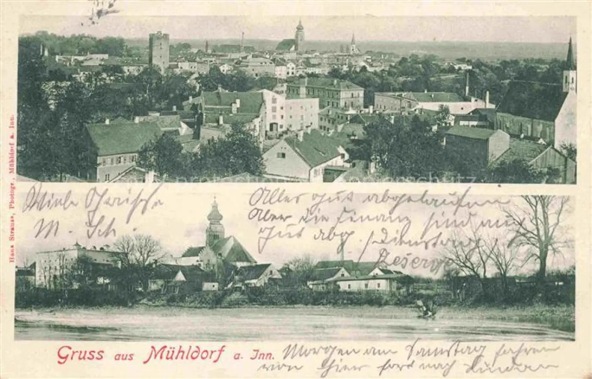 alte Postkarte Muehldorf Inn Bayern Panorama Blick zur Kirche postalisch gelaufen Erhaltung siehe scans [FriedD77]