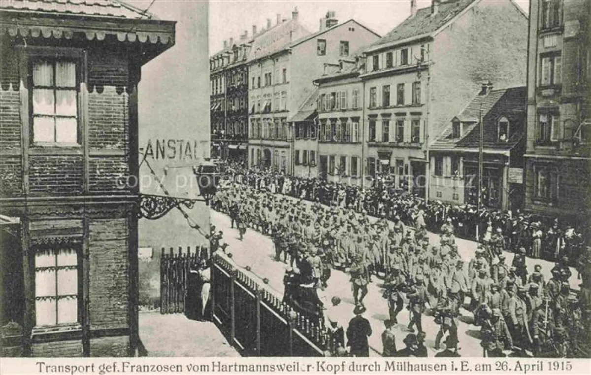 14098555 Muelhausen Elsass Gefangenentransport vom Hartmannsweiler Kopf durch die Stadt 26. April 1915 postalisch nicht gelaufen Erhaltung siehe scans [FriedD77] Frie Katcode 11170068468224