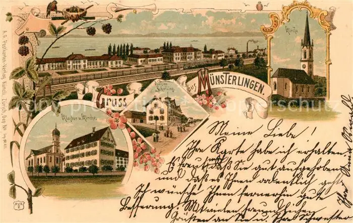 Muensterlingen_Bodensee Kloster und Kirche Pension Schelling Kirche Muensterlingen_Bodensee postalisch gelaufen 1902 Erhaltung siehe scans [WerneD78] WernPID7
