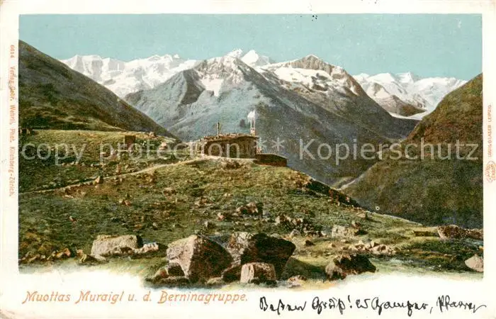 Muottas_Muragl_Muottas_Murail_2453m_GR mit der Berninagruppe postalisch gelaufen 1906 Erhaltung siehe scans [FriedD77] Frierer