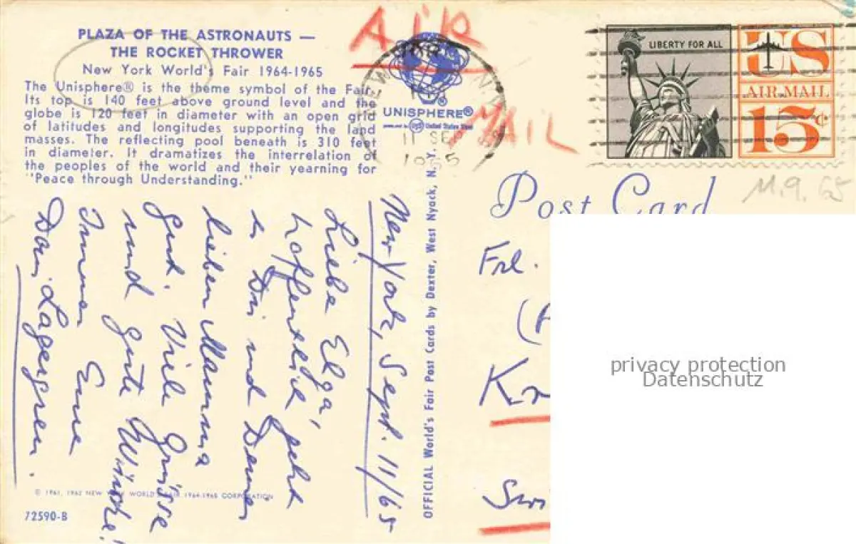 old postcard NEW YORK City USA Plaza of the Astronauts The Rocket Thrower postalisch gelaufen Erhaltung siehe scans [WerneD78]