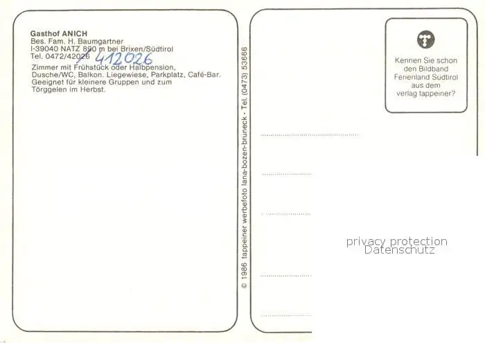 Natz_Brixen_Suedtirol Gasthof Anich Restaurant Landschaftspanorama Blick zum Ort Alpen Natz_Brixen_Suedtirol postalisch nicht gelaufen nach 1965 Erhaltung siehe scans [FriedD77] Frierer