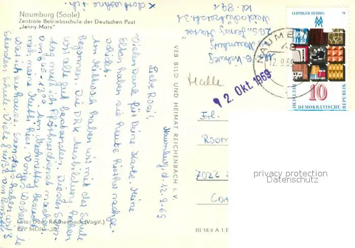 Naumburg_Saale Kategorie Alte Ansichtskarten Postkarten bx74621 Naumburg_Saale Zentrale Betriebsschule der Deutschen Post Jenny Mark Naumburg_Saale postalisch gelaufen 1969 Erhaltung siehe scans [PaolaD17]
