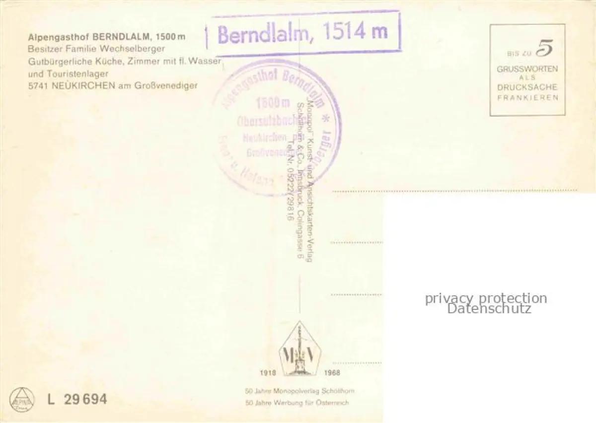Neukirchen Grossvenediger Pinzgau-Pongau AT Berndlalm Alpengasthof postalisch nicht gelaufen Erhaltung siehe scans [WerneD78] Wern Katcode 11390322050614