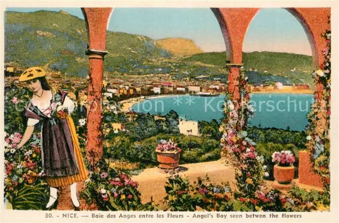 Nice_Alpes_Maritimes Panorama Baie des Anges entre les fleurs Nice_Alpes_Maritimes postalisch nicht gelaufen 1939 Erhaltung siehe scans [FriedD77] Frierer
