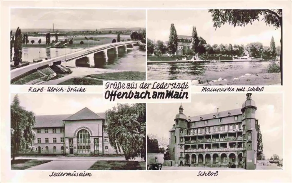 alte Postkarte OFFENBACH MAIN Karl Ulrich Bruecke Mainpartie mit Schloss Ledermuseum Schloss postalisch gelaufen Erhaltung siehe scans [WerneD78]