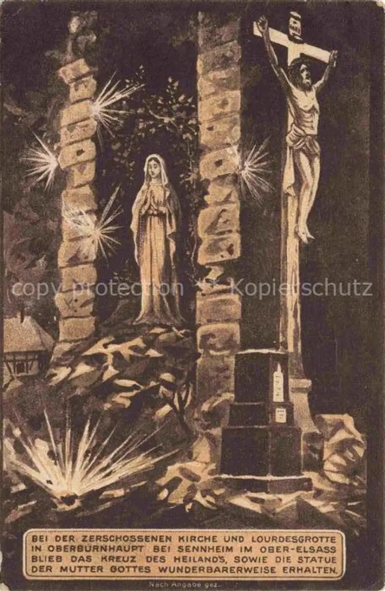 carte postale Oberburnhaupt Burnhaupt-le-Haut 68 Haut-Rhin Zerschossene Kirche Kreuz des Heilands Statue der Mutter Gottes Kuenstlerkarte postalisch gelaufen Feldpost - Stempel Erhaltung siehe scans [FriedD77]