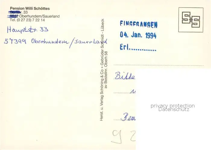 Oberhundem Pension Willi Schoettes Oberhundem postalisch nicht gelaufen 1994 Erhaltung siehe scans [FriedD77] Frierer