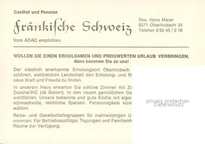 Obertrubach Gasthof Pension Fraenkische Schweiz Gastraeume Obertrubach postalisch nicht gelaufen nach 1965 Werbekarte (keine Postkarte) Erhaltung siehe scans [WerneD78] Werbekarte (keine Postkarte) WernPID7