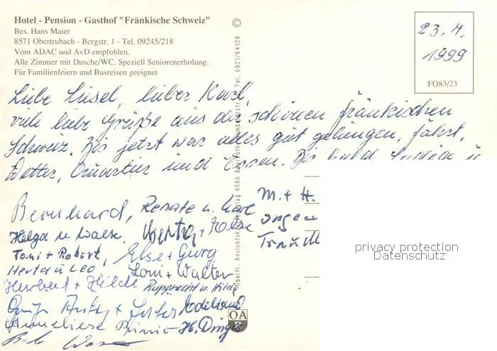 Obertrubach Hotel-Pension Fr?nkische Schweiz Obertrubach postalisch nicht gelaufen 1999 Erhaltung siehe scans [PaolaD17] PaolPID1