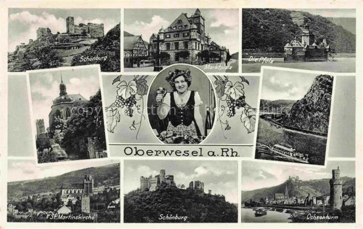 alte Postkarte Oberwesel Rhein Schoenburg Marktplatz Die Pfalz St Martinskirche Ochsenturm postalisch gelaufen Erhaltung siehe scans [WerneD78]