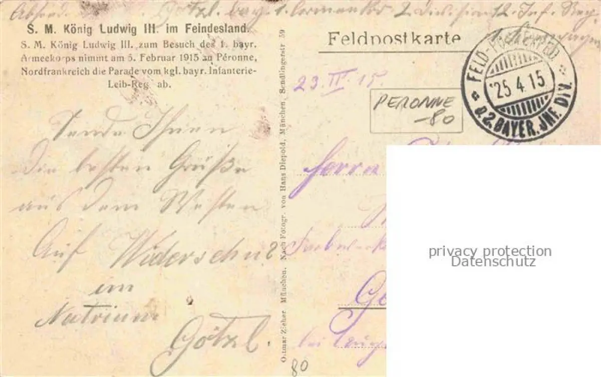 14116021 PERONNE 80 Somme S. M. Koenig Ludwig III. im Feindesland Besuch des 1. bayerischen Armeekorps Parade postalisch gelaufen Feldpostexpedition (Stempel) Erhaltung siehe scans [FriedD77] Feldpostexpedition (Stempel) alte Postkarte Frie Katcode 11170080480620