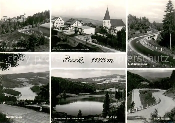 Pack Ortsansicht mit Kirche Langmannbruecke Serpentinen Stausee Pack postalisch nicht gelaufen ca. 1965 Erhaltung siehe scans [FriedD77] Frierer