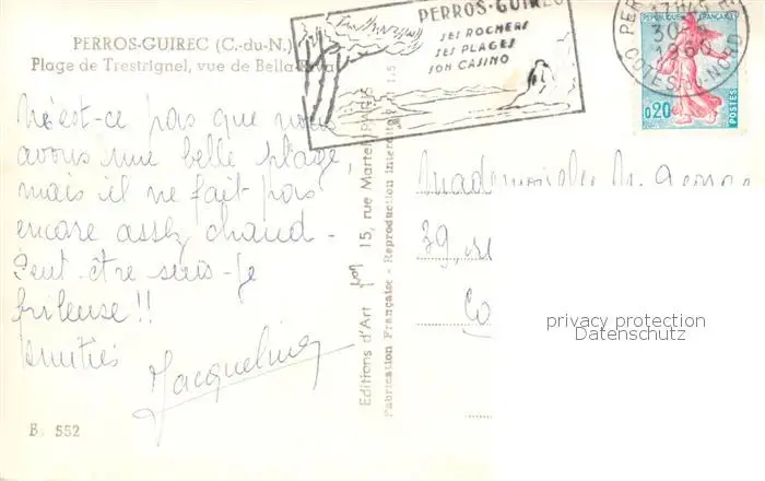 Perros-Guirec_22_Cotes-d_Armor Plage de Trestrignel vue de Bella Riva postalisch gelaufen 1960 Erhaltung siehe scans [FriedD77] Frierer