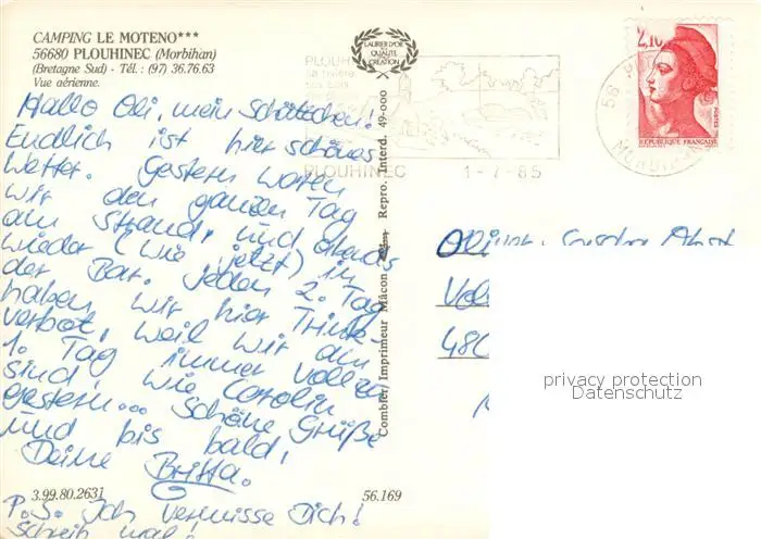 Plouhinec_Morbihan Camping Le Moteno vue aérienne Plouhinec Morbihan postalisch gelaufen 1985 Erhaltung siehe scans [FriedD77] Frierer