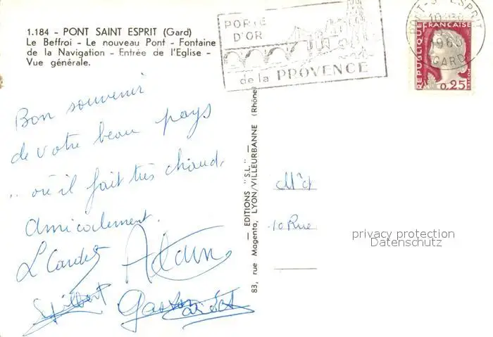 Pont-Saint-Esprit Le Beffroi Pont Fontaine de la Navigation Entrée de l'église vue générale Pont-Saint-Esprit postalisch gelaufen 1965 Erhaltung siehe scans [FriedD77] Frierer