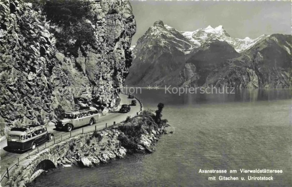 AK / Ansichtskarte Postauto Postbus Omnibus Axenstrasse Vierwaldstaettersee Gitschen Schweiz