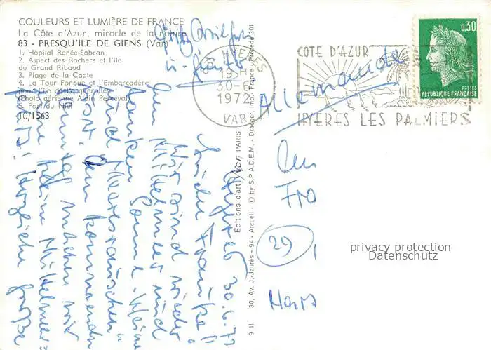 Presqu_Ile-de-Giens_83_Var Hopital Renee Sabran Rochers et l'Ile Plage de la Capte La Tour Fondue postalisch gelaufen 1972 Erhaltung siehe scans [WerneD78] WernPID7