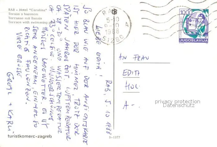 Rab_Croatia Hotel Carolina Swimming Pool Rab_Croatia postalisch gelaufen 1988 Erhaltung siehe scans [FriedD77] Frierer