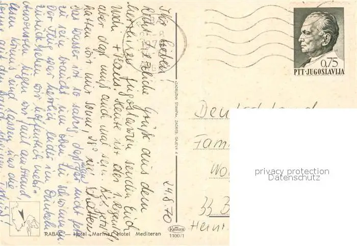 Rabac_Kroatien Hotel Marina Hotel Rabac Kroatien postalisch gelaufen 1970 Erhaltung siehe scans [FriedD77] Frierer