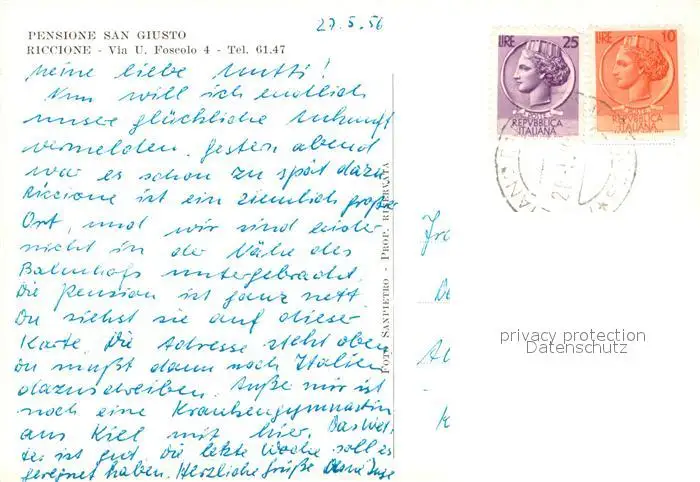 Riccione Pensione San Giusto Riccione postalisch gelaufen 1956 Erhaltung siehe scans [FriedD77] Frierer