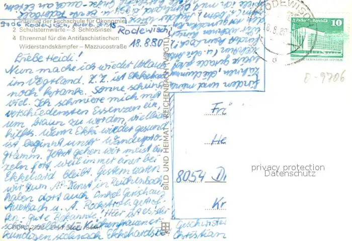 Rodewisch Internat Fachschule oekonomie Schulsternwarte Schlossinsel Ehrenmal Rodewisch postalisch gelaufen 1980 Erhaltung siehe scans [KathaD81] Kathoren