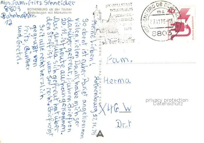 Rothenburg_Tauber Roederbogen mit Markusturm Rothenburg Tauber postalisch gelaufen 1975 Erhaltung siehe scans [FriedD77] Frierer