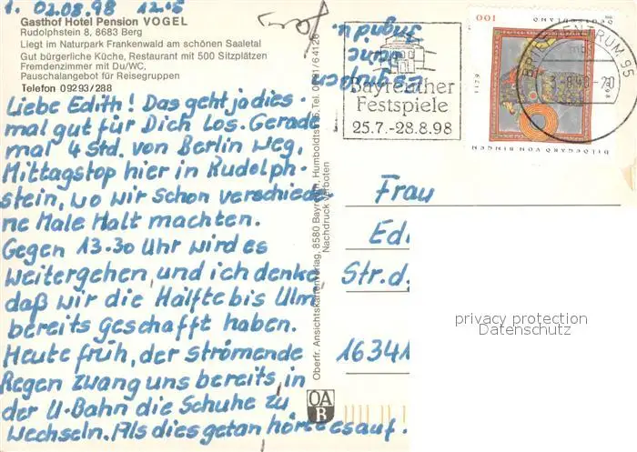 Rudolphstein Gasthof Vogel Rudolphstein postalisch gelaufen 1998 Erhaltung siehe scans [WerneD78] WernPID7