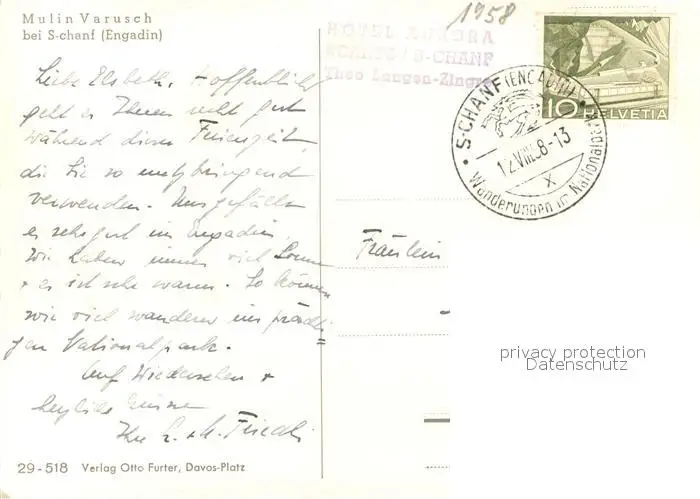 S-chanf_GR Mulin Varusch postalisch gelaufen 1958 Erhaltung siehe scans [WerneD78] WernPID7