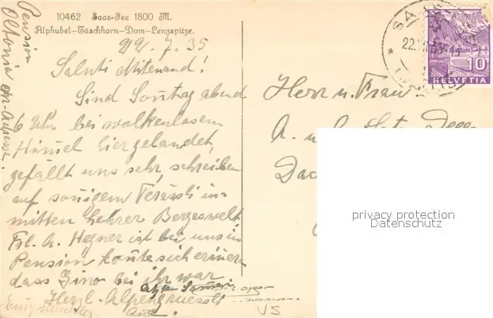Saas-Fee Alphubel Taeschhorn Dom Lenzspitze Saas-Fee postalisch gelaufen 1935 Erhaltung siehe scans [FriedD77] Frierer