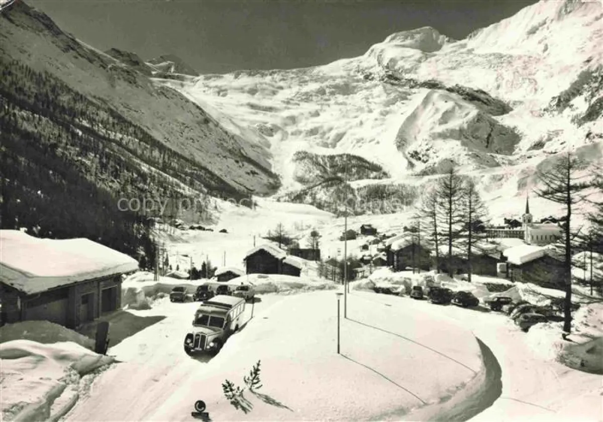 AK / Ansichtskarte Saas-Fee VISP VS Parkplatz Postauto Allalinhorn Alphubel Wintersportplatz Walliser Alpen